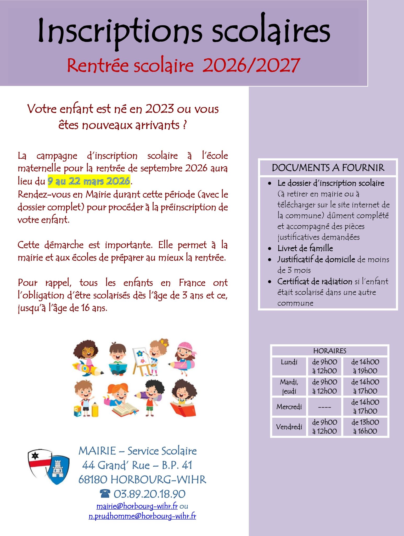 Le service des affaires scolaires de la mairie de Horbourg-Wihr procèdera aux inscriptions du 9 au 22 mars 2026 en Mairie (Accueil – Service affaires scolaires).